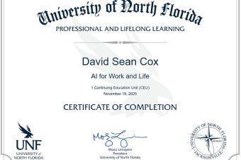 I’m super-stoked to report that I’ve completed a very helpful course of study presented by the University of North Florida—AI for Work and Life. It was an online course with eight one-hour sessions, presented by AI academics at UNF and other universities, and leaders and users from the healthcare, legal, and financial sectors.